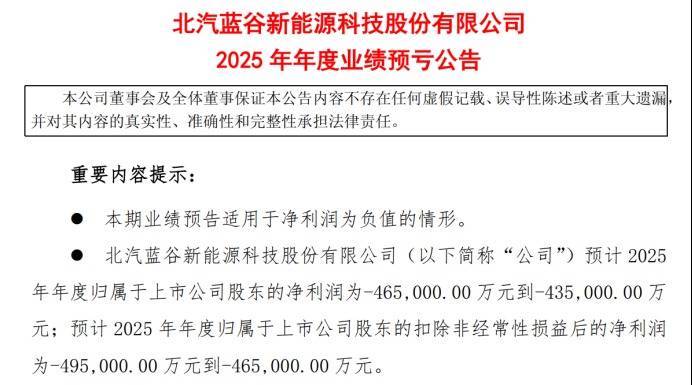 北汽蓝谷新能源科技股份有限公司2025 年年度业绩预亏公告